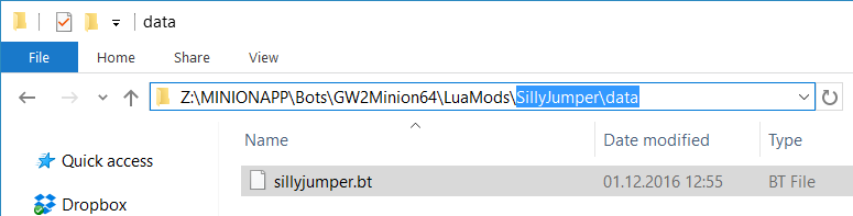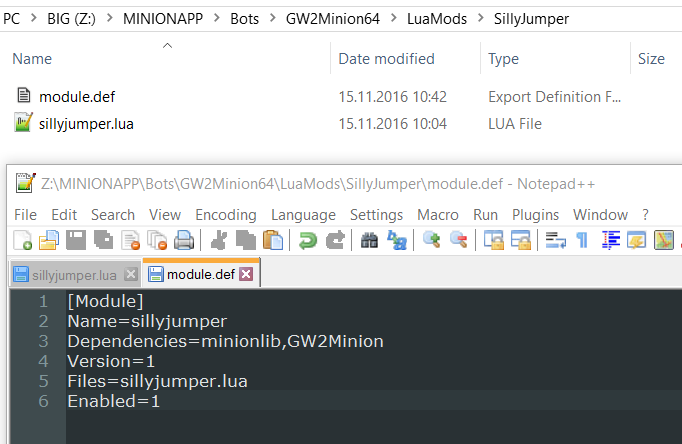 [Module] Name=sillyjumper Dependencies=minionlib,GW2Minion Version=1 Files=sillyjumper.lua Enabled=1
