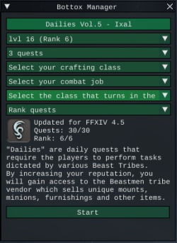 Depending on which volume you're using, you will choose how many quests you want to run, and for oldest daily quests the level of the quest. Also select the job(s) you prefer after you make sure you you properly added the Gear Sets ids onto Bottox Manager settings. Then simply press start, the bot will do everything until all quests are done.