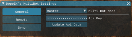 [MultiBot Mode] Specifies whether the bot sets preferences for other bots or takes them over. Only one active instance should be set as master, all other instances should be set to slave. [Api Key] (Optional) An Api Key can be entered here so that you can also change characters with the remote control. The Api Key must have the authorization to access the character information.[Update Api Data] If an api key is entered the character list can be updated with this button.