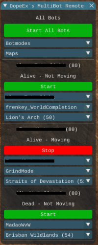 In the first section of the remote control you can change settings like bot start/stop, bot mode and map for all bots at the same time. After that there is always a section for every single bot instance where some status information about the bot instance is displayed (character, level, life status, movement status, bot status, bot mode, map). The dropdowns always show the status of the instance, but you can also use them to change the corresponding settings.