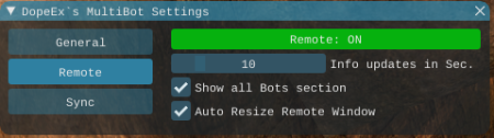 [Info updates per Sec.] Defines the interval (in seconds) in which the info data is read and written. This does not apply to the reading and writing of control commands.[ ] Switches the upper section in the remote control to command all bots, on and off.[ ] Defines whether the size of the remote control is freely definable or whether it automatically adapts to the content.