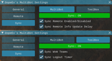 [ ] Synchronizes between all instances where this function is enabled whether the remote function is on or off.[ ] Synchronizes between all instances where this function is enabled, the info update delay.[ ] Synchronizes the WvW Team Ids between all instances where this function is enabled.[ ] Synchronizes between all instances where this function is enabled, the settings and status of the logout timer.