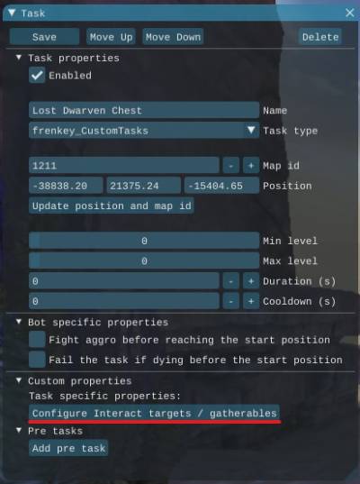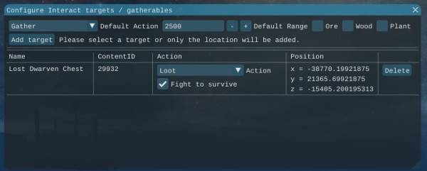 Configure Interact targets / gatherables edit the targets to interact with or the locations you want to gather Default Action select the default Action you want to add when adding a targetDefault Range set the default range to gather or loot in[ ] Ore enables/disables gathering Ore by default [ ] Wood enables/disables gathering Wood by default [ ] Plants enables/disables gathering Plants by default Add target add the current target / location to the tableWithin the table you can configure each task again with the same options as before.