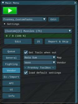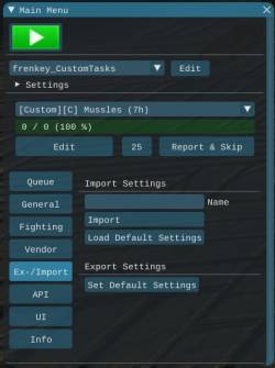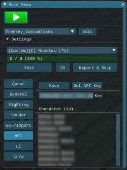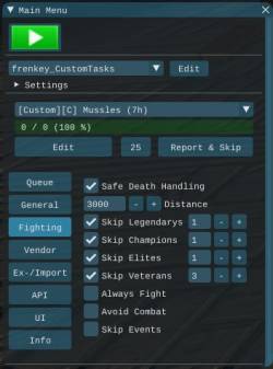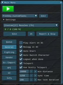 [ Report & Skip ] skips the current task and creates a report to hand in[ Edit ] opens the edit tab to adjust the current profile[ ] Play Alert on DC plays an alert when disconnected[ ] Relogg on DC enable/disable automatic relogging when disconnected[ ] Auto Start enable/disable automatic start of the last run TaskProfile[ ] Auto Switch Character enable/disable automatic character switch to continue with the account wide queue[ ] Logout when done bot will logout when the hole account queue is done[ ] Teleport enables teleporting, required[ ] Use Scotty Teleport enables Scotty's teleport function instead of the included[10000][-][+] min distance sets the minimum distance before teleporting. This will not be checked if target location is not on the same mesh.[1250][-][+] sync time sets the wait duration after teleporting to let the map load[180][-][+] max task duration sets the maximum duration a task can be run. This is added to prevent stucks and endless fighting.
