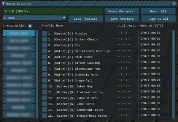 [ Reset Character ] resets the current selected character[ Reset All] resets the all characters[ Load Template] loads the selected template[ Save Template] saves the currently selected profiles as a template[ Copy to all ] copies the selected profiles from the current character to all other charactersCharacterlist [grid symbol] opens the configuration of the characterlist to disable characters which should not use the queue