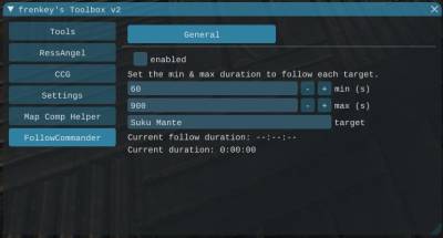 [ ] enabled enables/disables the usage of the helper[ 60 ][+][-] min (s) sets the minimum duration to follow a target[ 900 ][+][-] max (s) sets the maximum duration to follow a target[ NAME ] target shows the current targets namecurrent follow duration shows the duration for how long the current target is followedcurrent duration shows the duration for how long the current target will be followed. This is a random number created from min and max duration