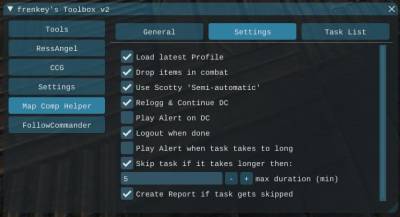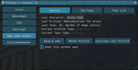 Last Character displays the last/current used character with CustomTasks. This will also be the one that's used to log back in.Last Profile displays the last/current run Profile. This will also be the one that's started again when logging in on that character.Last Task displays the last/current run Task. This will also be the one that's started again when logging in on that character.Current Profile Time displays the runtime of the current taskprofile. This takes in account even the not played hours atm.Current Task Time displays the runtime of the current task. This takes in account even the not played hours atm.[ Skip & add ] skips the current task and adds it to the Task List[ Reset Profile ] resets the current profile to make it “runable” again[ Continue Last Profile ] sets the BehaviorMode to CustomTasks, loads the last Profile and last Task, starts the bot and if selected enables Scotty's semi automatic[ ] Keep this window open opens the toolbox and Map Comp Helper tab whenever its not up and CustomTasks are running