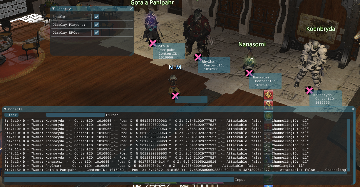 KitanoiRadar is similar to the inbuilt 3D radar packaged with mmominion, but with the click to export button added. By clicking the button that is placed on the npc or player, the the follow data is exported to the console: