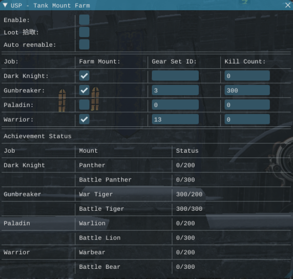 Enable (With any job option ticked) – Will enter dungeons if Gear Set ID is not blank, nil or 0 and Kill count is <300. If either of these conditions are not met, the next job will be chosen. If no conditions are met, you will not enter any instance. It will keep doing the instance over and over until it hits 300 kill count, then change job and continue on the new job.