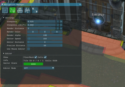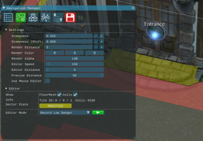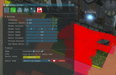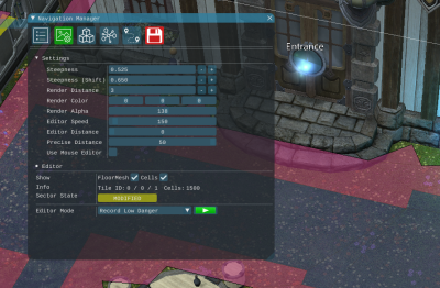 Default mesh do not contain 'cell' which is base data of navigation mesh. So need to create cell 1st to edit mesh. Once done you need to push red save button which looks like floppy disk.