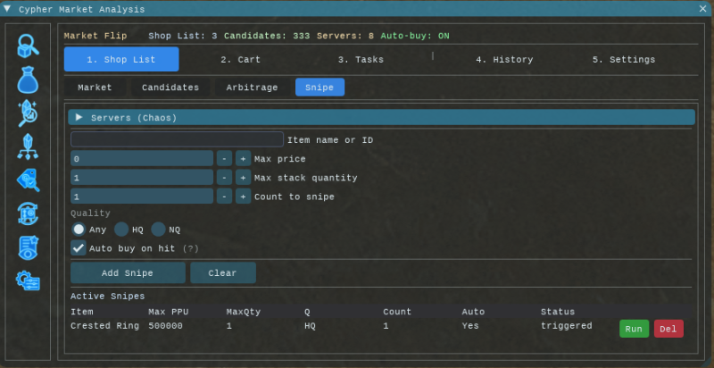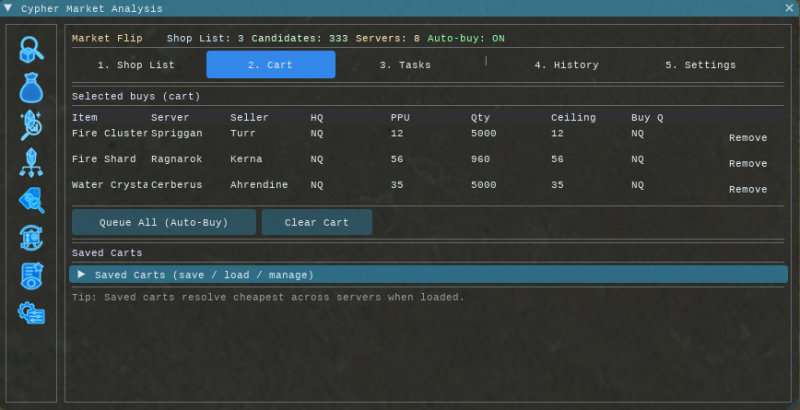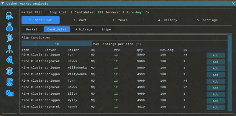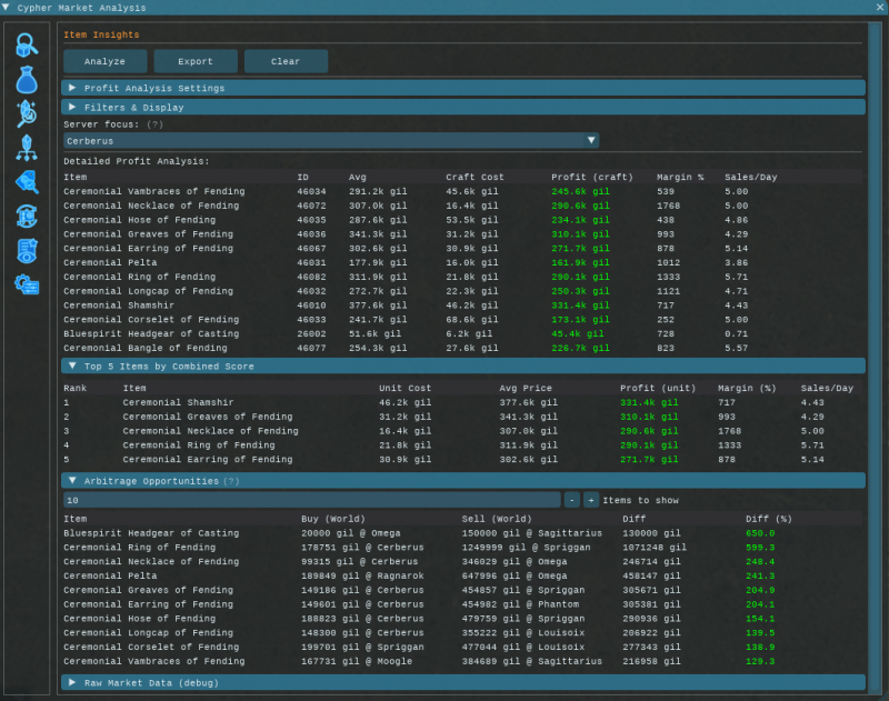 Cypher Market Analysis (CMA) is a market board helper for FFXIV. It pulls live Universalis data and gives you: