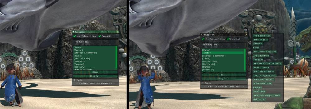 Navigator is a simple navigation assister, with a huge database(+ 3300 Spots !!). You can go everywhere, in a LEGIT WAY, to all : Towns, Storage & Commerce, Guilds, Bestial Camps, Merchands, Leeves, Aethernets, Entrance to Dungeons, Sectors, Botanist's nodes, Miner's nodes, Unspoiled Botanist's nodes, Unspoiled Miner's nodes, Monster's locations, Triple Triad's Npc, Switch Maps, Aether Currents, etc…