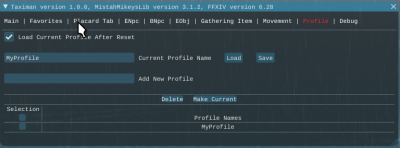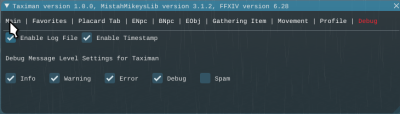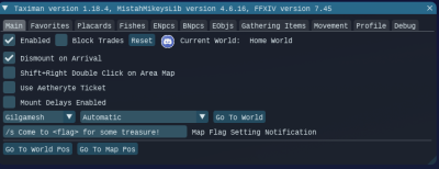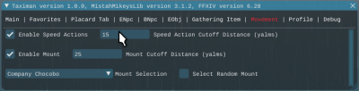 You start TM via the FFXIVMinion menu drop down. It's under the “MistahMikey” menu item. Clicking “Taximan” should pop up its UI window. The UI consists of different input areas called tabs that are selected by clicking the tab name that appears on the first line of the UI. Each tab is described below.