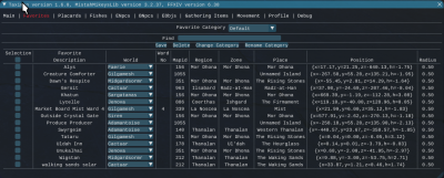 This tab allows you to save locations your character visits so you can return to them later. Different categories of favorites can be saved and displayed selectively via the Favorite Category dropdown control. The “Default” category is a fixed category that existing entries that existed prior to the addition of the Favorite Category feature are automatically assigned. In the locations table, you can change the destination world for the favorite location by using the drop down in its entry. The controls on this tab are: