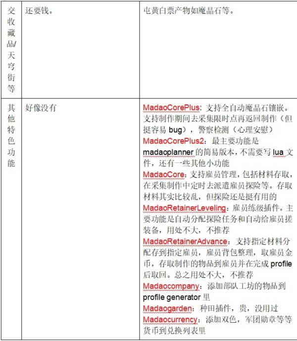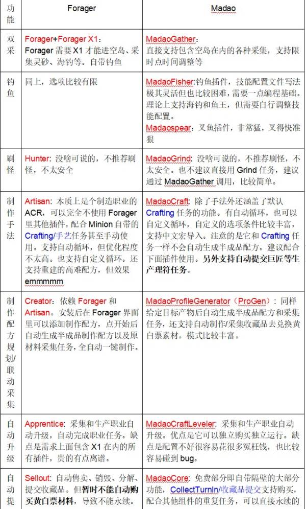 生产采集插件主要有两套体系,Ace/Sebbs的Forager套装和Madao套装。由于我大部分都已经购买了,价格我无法看到也懒得去查了,用表格稍微对比一下功能: